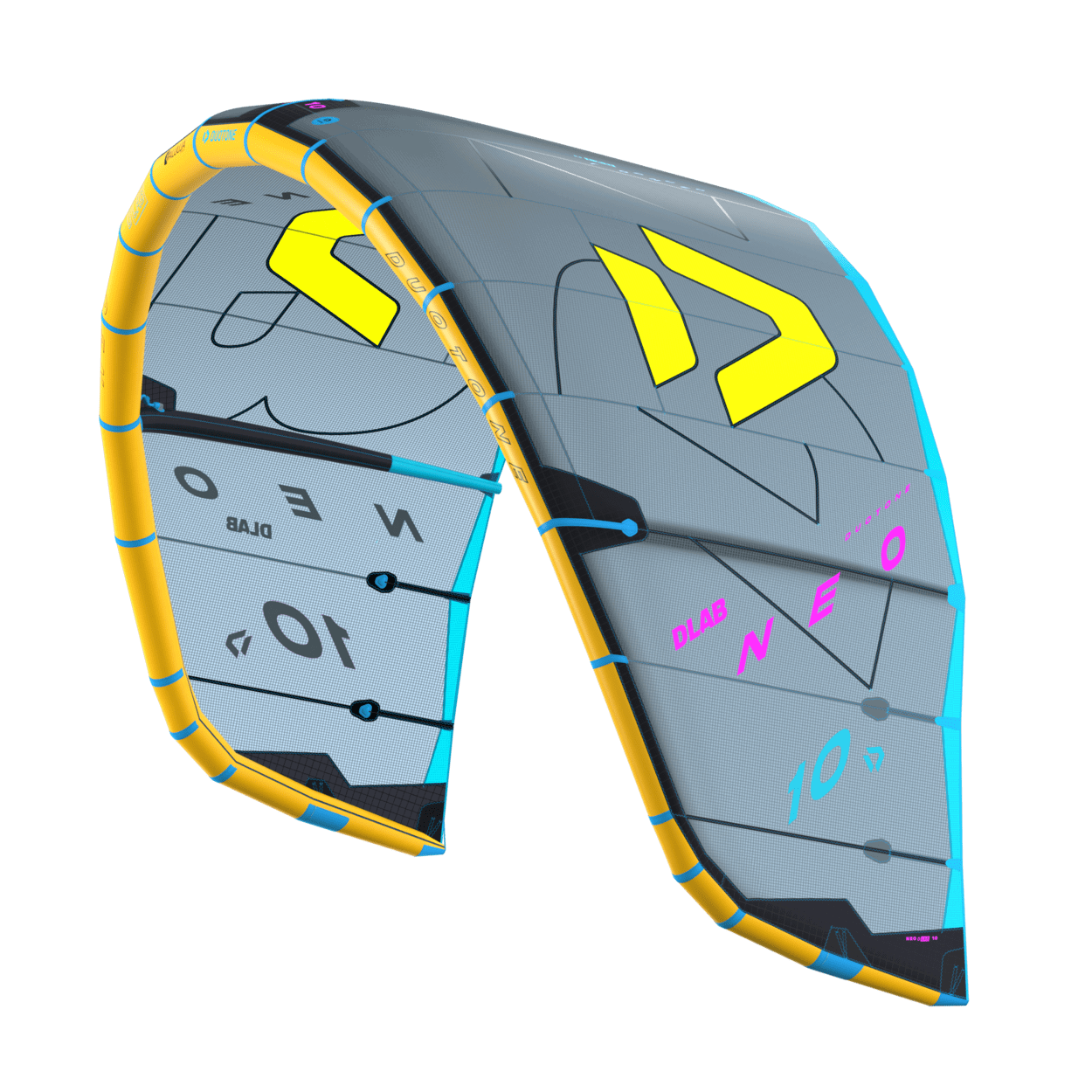 With the perfect combination of Aluula and Trinity TX materials, the Neo D/LAB offers unmatched drift, responsiveness and performance characteristics. Take your wave riding to the next level with the Neo D/LAB's incredible drift ability, ensuring precise control and overall stability. Experience the smoothest and most refined handling, allowing you to effortlessly navigate through any wave and wind conditions with confidence. Benefit from the widest wind range in the Neo range, providing versatility and reliability in varying wind conditions. The intuitive bar feedback is tailored especially for experienced wave riding enthusiasts, enhancing the connection to the kite for maximum control and responsiveness. The Neo D/LAB features super-fast, dynamic turning and handling, thanks to its innovative Hybrid Flex Strut design, offering quick steering initiation and impressive agility on the waves. The Neo D/LAB's geometry includes a reduced Leading Edge diameter for quick depower and excellent top end performance, complemented by the innovative lightweight batten pocket construction and the newest MOD 3S trailing edge. Each size is fine-tuned for optimized comfort and performance, with a focus on quick steering initiation and very responsive wingtip shapes. Built for superior performance and innovation, the Duotone Neo D/LAB combines the absolutely best and most innovative available materials such as Aluula and Trinity TX, to deliver an exceptional kite experience. Step up your wave riding skills and immerse yourself in the thrill of challenging surf conditions with the Neo D/LAB.